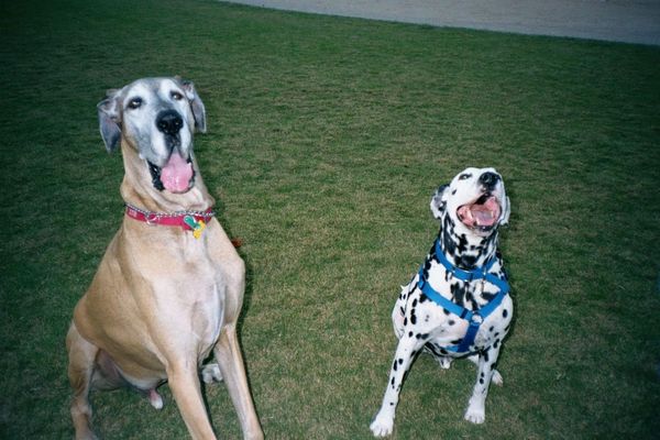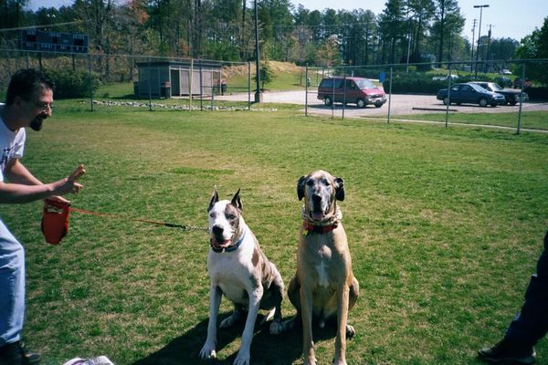 Max and Bud behaving. They enjoyed running loose at the baseball field.